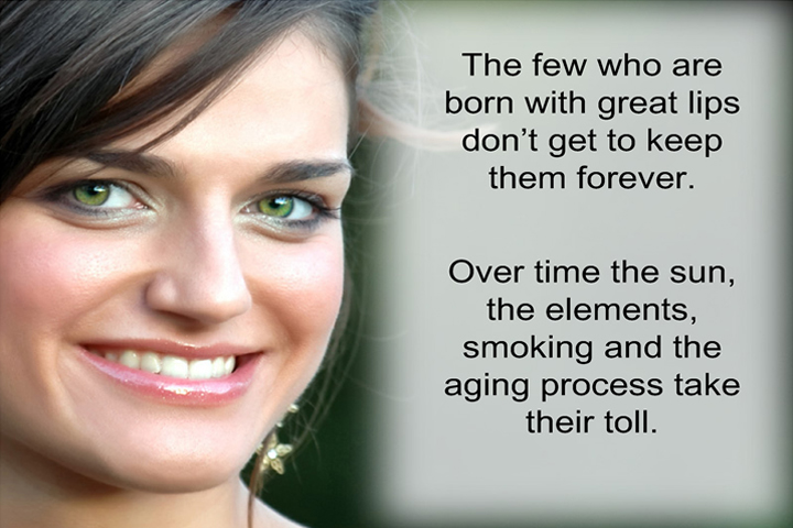 Sensual lips are a key element of almost every photo in every fashion magazine. Unfortunately, not everyone is blessed with a pair of naturally beautiful lips. The few who are don’t get to keep them without a little help. Over time the sun, the elements, smoking and the aging process take their toll. The corners of the mouth begin to droop. The V-shaped area of the upper lip known as Cupid’s Bow begins to flatten out and lose its youthful fullness. Vertical wrinkles or Smoker’s Lines begin to appear, causing your lipstick to bleed. That once sensual look is gone or greatly diminished.